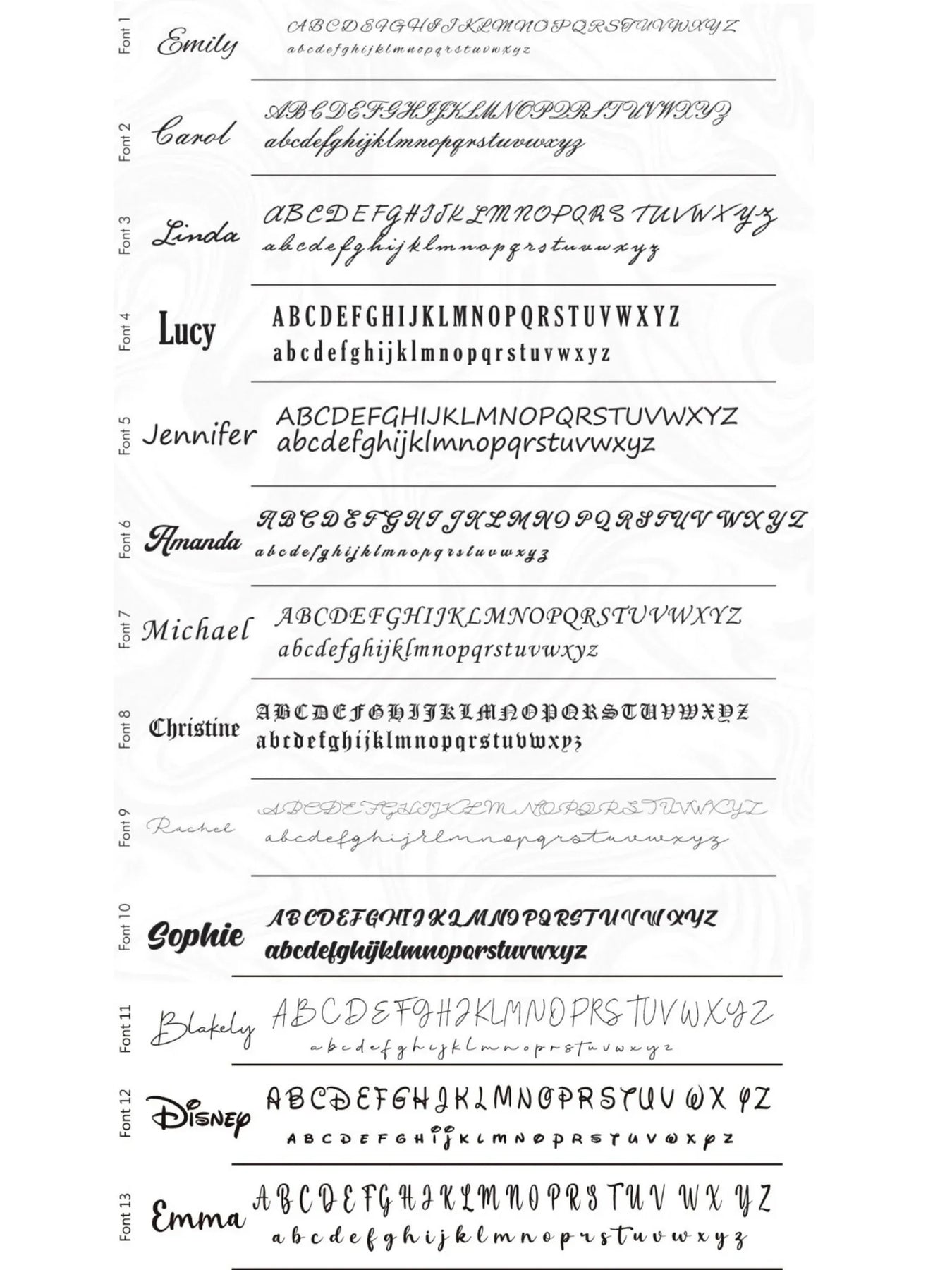 • Choose your favorite engraving font from the guide and specify it at checkout.